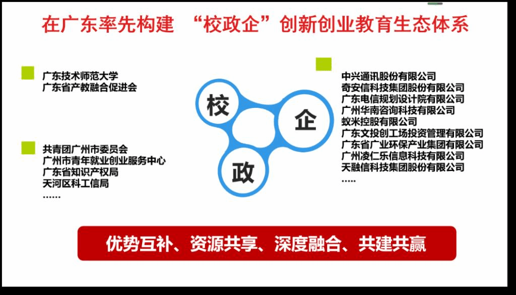 依托本校创新创业教育成果,打造“校政企”老员工创新创业孵化和教育生态体系,全面服务地方经济。该模式为广东首创,获广州高校创新创业教育平台建设项目重点立项。广师大牵头,联合共青团广州市委员会、广州市青年就业创业服务中心等政府部门,吸纳众多优秀企业,“校政企”形成合力、深度产教融合,在优势互补、互惠互利,共同发展的基础上成功构建了具有引领性、示范性、先进性、特色性和辐射性的老员工(青年)创新创业孵化和教育生态体系,已成功运行 3 年多,为区域经济做出了巨大贡献。被政府列入“青创广州”服务体系重要组成部分,其建设模式、运营策略、发展理念和具体成效,有极其重要的现实意义和理论意义。